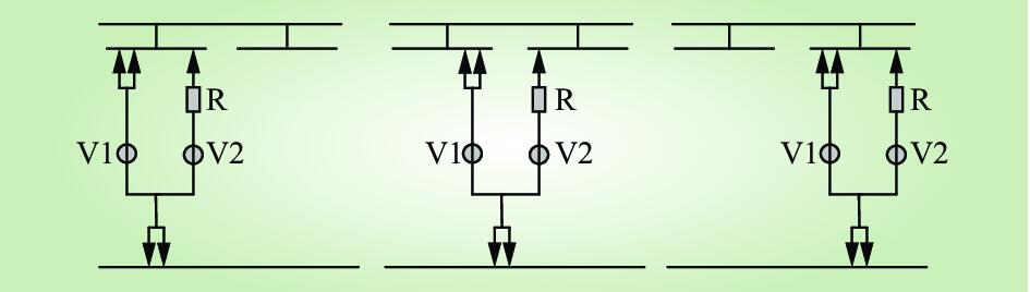 (3)真空滅弧型。機械式真空滅弧型有載調(diào)壓開關(guān)不同于傳統(tǒng)的絕緣油滅弧,分接頭切換在真空管中完成,不存在切換電弧造成油劣化和污染問題。機械式真空滅弧型有載調(diào)壓開關(guān)功能實現(xiàn)的關(guān)鍵是真空切換開關(guān)的選擇與過渡電路的設(shè)計,性能水平主要取決于真空觸點的切換參數(shù),包括額定電流、額定電壓與額定容量。機械式真空有載調(diào)壓開關(guān)切換電路具體如圖3所示[16],R為過渡電阻,V1、V2為真空管。