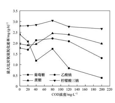實驗進水NH4+-N和NO2--N濃度分別為80 mg˙L-1和120 mg˙L-1.考察4種有機物葡萄糖、蔗糖、乙酸鈉、檸檬酸三鈉在COD濃度梯度0、20、40、80、120、200 mg˙L-1時對厭氧氨氧化反應的影響.