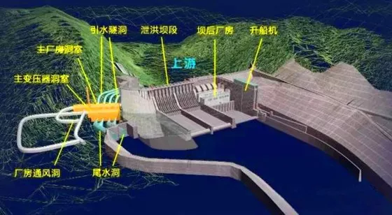 我國的四川省宜賓縣金沙江下游建設(shè)的向家壩水電站采用實體重力壩,最大壩高161米,壩頂長937.5米。水電站除了在靠左岸建設(shè)壩后廠房外,在右岸山體內(nèi)開挖了地下廠房。地下廠房由主廠房洞室與主變壓器洞室組成,4條引水隧洞從上游岸邊連通廠房4臺水輪機,4條尾水隧洞并為2條后通往下游江邊,除此還有進(jìn)廠交通洞、通風(fēng)洞、排水洞、出線洞、母線洞、安全兼施工洞等。