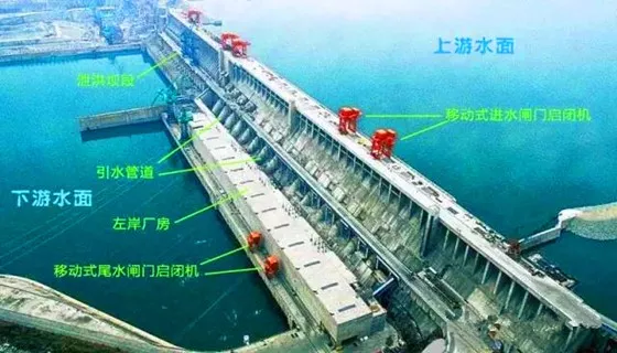 世界上最大的水電站我國的三峽水電站就是壩后式水電站,采用混凝土重力壩。圖5是從下游遠(yuǎn)方眺望三峽水電站的照片,在照片中標(biāo)出了主要壩段的分布:大壩中間部分是泄洪壩段,兩側(cè)是發(fā)電廠房壩段,再兩側(cè)是非溢流壩段。