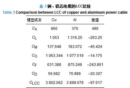 (2)案例中鋁芯電纜雖然購置成本更低,但敷設(shè)成本和運行維護成本、故障損失成本等后期運行成本均處于劣勢,使得總LCC更大,故銅或鋁芯電纜的選擇不應(yīng)只看初始投資。