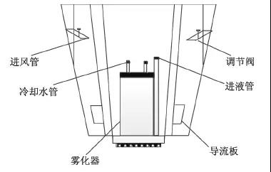 氣體分布器和霧化器的布置如圖3所示,熱空氣通過若干進(jìn)風(fēng)管和調(diào)節(jié)閥的控制均勻進(jìn)入進(jìn)風(fēng)通道中,通過導(dǎo)流板的調(diào)節(jié)呈一定角度旋轉(zhuǎn)并與旋流霧化器出來的霧滴進(jìn)行充分接觸和強(qiáng)烈的傳質(zhì)傳熱反應(yīng)。