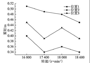 另外,霧矩的大小還有霧化器的轉(zhuǎn)速有關(guān),如圖8所示。給液量為1.5kg˙h-1,隨著轉(zhuǎn)速的增加,霧矩呈減小趨勢。從圖中也可以看出,3個(gè)位置的霧矩差距較大,其源于霧矩的不均勻性。但在實(shí)際運(yùn)行過程中,為了避免未蒸發(fā)液滴的粘壁,往往以最大霧矩作為設(shè)計(jì)與運(yùn)行的依據(jù)。